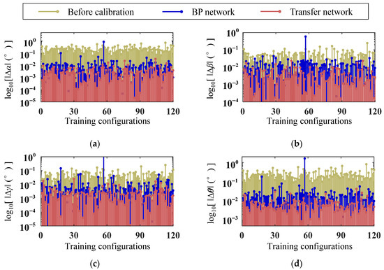 - . In this sample range, the transfer networks exhibit a lower average prediction error compared to the BP networks, indicating a notable performance advantage. However, due to the extremely limited number of samples, the predicted accuracy of the networks is constrained. Even for the higher-precision transfer network, the average orientation volumetric error after calibration in this range can only be reduced to 1.158°, which is larger than that before calibration of 0.203°. This contradicts the purpose of error compensation. As a result, within this range, neither the transfer network nor the BP network can meet the practical application requirements in marine engineering. They are not acceptable in the field of shipborne stabilized platforms’ kinematic calibration.