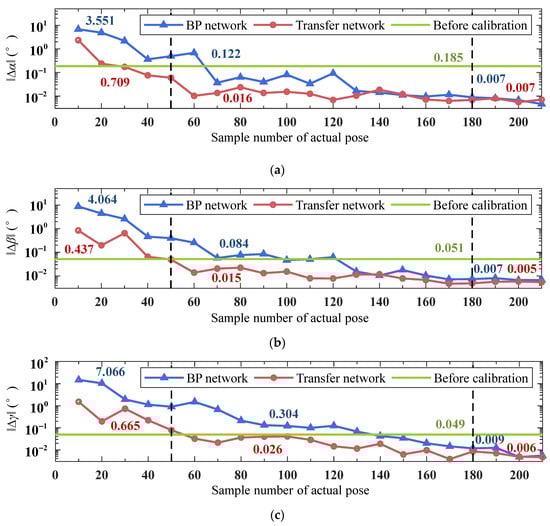Following the simulated process described in the preceding section, multiple sets of transfer networks and BP network models are trained by varying the number of actual pose samples. Based on the simulation results, how the sample number of the actual pose obtained in the field of shipborne stabilized platform calibration affects the effectiveness of the transfer learning method is explored. The performance comparison on the testing set of the transfer network and the BP network under varying sample numbers of the actual pose is illustrated in Figure 10.