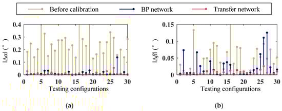 - . In this range, considering each evaluation index, transfer networks continue to demonstrate certain performance advantages over the BP networks. The average for transfer networks is 0.364°, smaller than the BP networks’ 0.038°. Furthermore, as the sample size increases, the transfer network achieves improved absolute prediction accuracy, notably surpassing the accuracy before calibration. This indicates that not only can the transfer network meet the practical calibration application requirements, but it also exhibits stronger predictive capabilities than the conventional BP network. Thus, transfer learning is the most appropriate approach within this range.