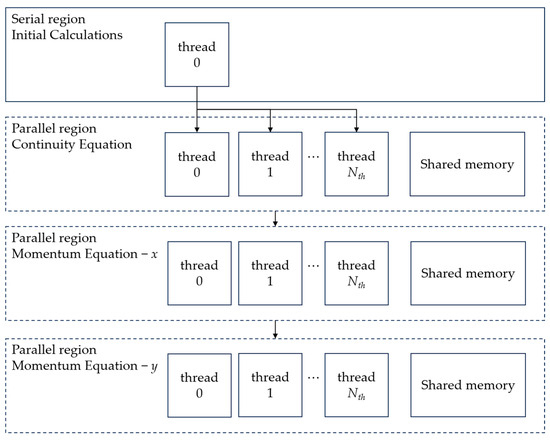The code for the model presented here has been developed in Fortran 95, with a set of compiler directives and runtime library routines to indicate parallel regions without having to deal with the low-level details of thread creation, synchronization, and communication. The most important directive is the one defining the parallel regions, which are blocks of code that are going to be executed by multiple threads running in parallel. Out of these regions, the code is executed by only one thread, i.e., the serial regions. When a thread encounters a parallel region while executing a serial region, it establishes a team of threads and assumes the role of the team’s master thread. The master thread is not only the initiator of the team but also actively participates in the computations. Within the parallel region, each thread is assigned a distinct thread number, starting from zero for the master thread and extending up to Nth − 1, where Nth represents the total number of threads in the team (Figure 2).