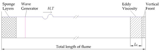 The numerical grid was 42 m long and was discretized with a spatial step of 0.025 m, with the total simulation time set to 100 s. Two sponge layers were placed at both sides of the numerical domain with a length of 6 m to minimize the effect of reflected waves from the tips of the numerical tank. The wavemaker was placed at a distance of 10 m from the starting point of the sinusoidal undulations. The numerical configuration of the experiment used in the HMS model is showcased in Figure 6.