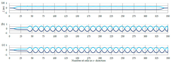Figure 4. Envelope plot of the surface elevation (lower bound: dark blue line, upper bound: light blue line) for a regular wave scenario (d/L = 0.16, H/L = 0.01). (a) No reflection—sponge layers on both sides of the flume ( m2/s, ); (b) full reflection—vertical wall on east side of the flume without eddy viscosity ( m2/s, ); (c) partial reflection—vertical wall on east side of the flume with eddy viscosity ( m2/s, ).
