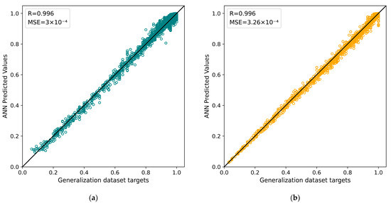 Ultimately, upon the conclusion of the ANN training and validation, MSE values close to zero were achieved, accompanied by a correlation factor approaching 0.996. Figure 5 depicts the ANN-predicted values plotted against the corresponding targets in the generalization dataset for both the regular and irregular waves.