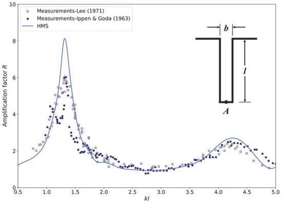 Figure 8 showcases the variations of both the measured and the simulated amplification factor () in relation to the parameter kl, where k denotes the wavenumber and l the length of the basin. As a supplement, Figure 8 also contains the definition of the dimensions of the rectangular harbor.