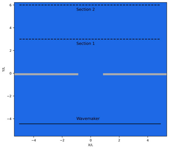 Yu et al. [83] conducted a series of experiments focusing on the irregular wave diffraction through a breakwater gap. The experiments were carried out in the wave basin at the Dalian University of Technology, measuring 55 m in length, 34 m in width, and 1.3 m in depth. The breakwater was positioned parallel to the wavemaker, situated 7 m away from the wavemaker’s location. The still-water depth, h, inside the basin remained constant at 0.4 m. The breakwater, featuring a thickness of 0.35 m, had a gap in the center formed by two semi-circular tips. Two gap widths were explored in the experiments: 3.92 m and 7.85 m. To minimize wave reflection, absorbing layers with a width of 0.8 m were placed waveward of the breakwater. Various angles of wave attacks relative to the breakwater’s placement (i.e., 90°, 75°, 60°, and 45°) were investigated to study the combined effects of refraction and diffraction. Wave heights were measured at two cross sections parallel to the breakwater and at a normalized distance of = 3.0 and = 6.0 shoreward of the breakwater (with representing the wavelength corresponding to the peak wave period).