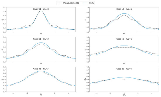 To assess the capability of the HMS model to simulate the Bragg scattering of regular waves over a bed with sinusoidal undulations, the experiment of [82] was reproduced. The experiments were conducted in a wave tank with dimensions of 45.72 m × 0.91 m × 0.91 m. A patch of sinusoidal bars with the wavelength of S = 1.0 m was built into a false bottom in the tank. Two wave gauges (G1 and G2) were placed in front of the bars to calculate the reflection coefficient, according to the two-point method proposed by [88], at respective distances of about 5.125 m and 4.875 m, measured from the starting tip of the bar. Test 1 of [40]’s experiments were reproduced numerically with the HMS model. In this particular test, the number of bars is N = 4, the water depth was kept constant at 0.156 m, while the amplitude of the bars was set to 0.05 m. The experimental test contains a series of regular incident wave conditions with various wavelengths.