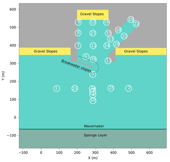 Absorbing sponge layers, with a width of 2.3 m, were placed at the south and north boundaries of the numerical domain to minimize wave reflection. The spatial step was set equal to 0.05 m in both directions. To discretize the wave spectrum, 25 wave components were considered, and the total simulation time was set to 150 s, which was sufficient to achieve a steady-state solution. The layout, showcasing the numerical domain configuration of the experiment, is shown in Figure 9.