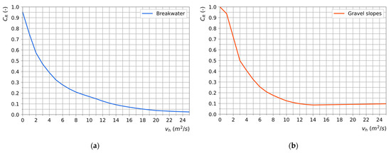 - An estimation of the incident wave characteristics on the waterfront and a determination of the anticipated wave reflection. The latter depends on a multitude of parameters [40], the most important of which are the incident wave height and period, the depth at the structure’s toe, and the type of the front (partially dissipative or fully reflective). An additional parameter that influences the wave reflection is if the incident sea-state is considered as regular or irregular [51]. For a preliminary estimation of the reflection coefficient, informative diagrams (e.g., [52]) may be used, while more precise determinations can be made using reflection coefficient formulas. A plethora of formulas for predicting the reflection coefficient have been developed, based on either limited datasets related to specific structures (e.g., [46,53,54,55,56]) or more extensive ones (e.g., [57,58,59]) that consider various types of structures derived from extensive experimental datasets. An even more accurate approach involves leveraging advanced tools based on machine learning techniques, such as the neural network developed by [60,61] for predicting wave reflection from coastal and harbor structures.