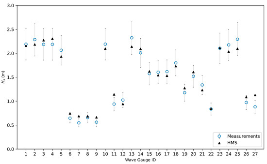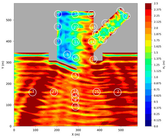 The experiments concerning irregular unidirectional and multidirectional (for narrow and broad banded directional spectrum) direct wave attacks were reproduced with HMS, for the layout, with a breakwater gap of 3.92 m. The simulated cases of [41], simulated with HMS, are shown in Table 2, where is the incident wave angle, α is the spectrum Philips constant, γ is the spectrum peak-enhancement factor, and s is the directional spreading parameter.