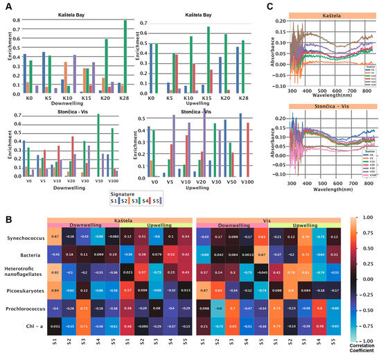 Furthermore, S1 was also correlated (r = 0.87, p < 0.001) to Synechococcus, heterotrophic nanoflagellates, and Picoeukaryotes counts (Figure 2B, Kaštela downwelling panel) and spectral peaks of 356 nm and 593 nm. Enrichment of S3 was expressed in two peaks, one at 5 m and another one at 28 m. Furthermore, S3 (curve peak at 496 nm) showed a significant positive correlation to Chlorophyll a and Prochlorococcus (r = 0.71, p < 0.001 and r = 0.72, p < 0.001) (Figure 2B, Kaštela downwelling panel). Signatures S2 and S5 showed similar patterns as they started with low values, peaked at 10 m, and decreased afterward. At the same location and in the upwelling sensor (UW) (Figure 2A, right top), we observed a dominant presence of S3 and S1 with limited enrichment of S4 at 5, 10, and 15 m. The signature S1 (curve peaks at 356 nm and 597 nm) is also correlated with Chlorophyll a, Prochlorococcus, and Picoeukaryotes (r = 0.48, p < 0.001; r = 0.38, p < 0.001; r = 0.57, p < 0.001) (Figure 2B, Kaštela upwelling panel), indicating different community structures at the surface compared to the lower parts of the water column. S1 (Chlorophyll a, Prochlorococcus, and Picoeukaryotes) showed the highest enrichment at 0 and 28 m and the lowest at 10 m. At the Stončica-Vis DW station, we observed almost no presence of S2 and some level of enrichment in other signatures. Signature S4 started with low values, peaked at 20 m, and decreased as depth increased. Signature S1 showed the highest enrichment at the surface and decreased as depth increased, except for 100 m (Figure 2A, Stončica-Vis DW panel). Signature S3 showed enrichment at all depths, reaching a maximum at 50 m. Looking at the UW sensor at the same location, we observed minimal or no presence of S4 except at 0 m and 30 m. Vertical distribution of microorganisms is under significant influence of moving masses of seawater, alongside the influence of nutrients and light [25,26]. Therefore, this could be the reason for difficulties in prediction of different groups of microorganisms within the marine water column. S4 was also characterized by a strong positive correlation (r = 0.48, p < 0.001; r = 0.6 p < 0.001) towards Chlorophyll a and Prochlorococcus (Figure 2B, Stončica-Vis UW panel). Signature S5 (wide curve with a peak in 446 nm) showed dominant enrichment peaking at 5 m and 20 m. Signature S3 showed maximum enrichment at 0 m and 30 m and a strong correlation (r = 0.79, p < 0.001; r = 0.72, p < 0.001; r = 0.81, p < 0.001) with Synechococcus, Bacteria, and Heterotrophic nanoflagellates (Figure 2B, Stončica-Vis UW panel). Next, we calculated and analyzed the Chlorophyll a absorbance for both stations (Kaštela and Stončica-Vis). At the Kaštela station, we observed the highest absorbance at 30 m and minimum absorbance at 5 m depth, whereas at Stončica-Vis station, the highest absorbance was measured at 0 m and minimum at 100 m depth (Figure 2C). Interestingly, the second highest chlorophyll absorbance at Stončica-Vis station was at 30 m depth, where absorbance in the spectrum of 400 to 500 nm exceeded the absorbance of 0 m. Furthermore, V30 is also characterized by enriched S4 (DW), which is characterized by a broad, low-intensity curve located between 353 and 503 nm and an increased concentration of Prochlorococcus.