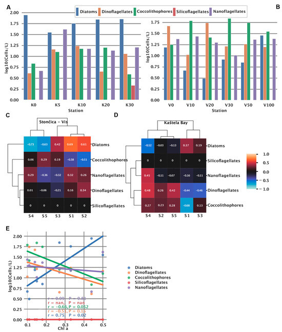 Phytoplankton significance at two study locations. (A) Phytoplankton abundance at the Kaštela Bay and (B) Stončica-Vis study sites. For the purpose of this study, we used only one sample per depth. Heatmaps (C,D) showing a correlation between different phytoplankton taxa and extracted spectral signatures at the (C) Kaštela Bay and (D) Stončica-Vis study sites. Correlations of phytoplankton taxa with Chlorophyll a (E).