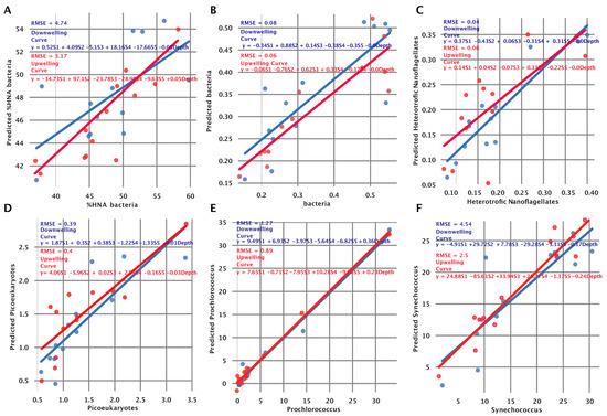 Linear regression models for prediction of phytoplankton and cyanobacteria abundance. (A) %HNA bacteria, (B) bacteria, (C) heterotrophic nanoflagellates, (D) picoeukaryotes, (E) Prochlorococcus, and (F) Synechococcus. The points represent the true value of abundance (x axis) and the predicted value of abundance (y axis), not the linear regression line. In the ideal case, this would be a clear diagonal line, indicating the perfect fit. The performance of the model is stated for each subpanel with root mean square error metric (RMSE) alongside the definition of a model (formula). Using the formula, readers can see which signatures are contributing to the prediction of abundance. Those models are fitted using a small amount of data, and they are for exploratory purposes. In other words, we wanted to test which microbial abundance groups we could predict and which ones we could not. This tells us if abundances are associated with extracted signatures (light spectrum), depth, or both.