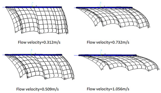 In this section, the wake flow is not considered in the numerical model and the flow velocity is constant. The deformed cages subjected to different flow velocities are shown in Figure 2.