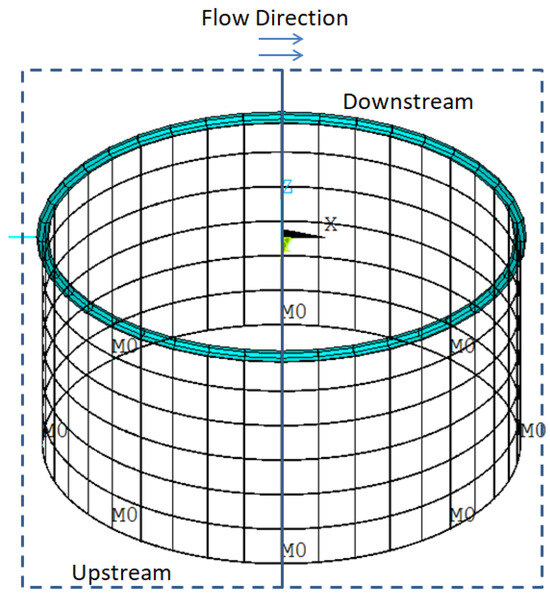 The counterweights are modeled by mass elements, which are added on eight notes according to the location of the physical model. The towing rope is modeled by a spring element. The height of the model is 6 m and the diameter of the model is 12 m. A total of 8 counterweights of 35 kg each are evenly distributed along the bottom circle of the model. To compare with the following result from the towing test [6], the numerical model is built as much as possible to be consistent with the physical model in the towing test, as shown in Figure 1. The flow direction is the positive x-axis direction. The dynamic equilibrium equation for the entire structure can be expressed as: