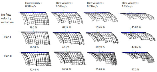 Furthermore, the upstream net has a much larger horizontal deformation than the downstream net, especially for Plan II. Around the border between the upstream and downstream net, the upstream part even moved to the right of the downstream part, which is never observed in experiments or field tests from [5,6,24,25,26,27]. It is due to the flow velocity downstream in Plan II being much smaller than the one upstream. The hydrodynamic load on the downstream part is much lower than the one acting on the upstream part. Additionally, when flow velocities are 0.732 m/s and 1.056 m/s for Plan II, the depths of the downstream net are much larger than the ones of the upstream net and the horizontal displacement is too small, which is also different from the observation of the experiment or field test.