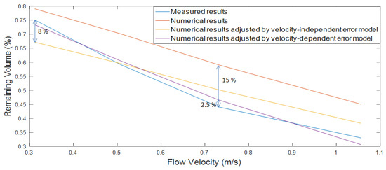 where is the remaining volume from the physical model, is the remaining volume from the numerical model and is the random error at a flow velocity , is the model error function and it is a constant for velocity-independent model error.