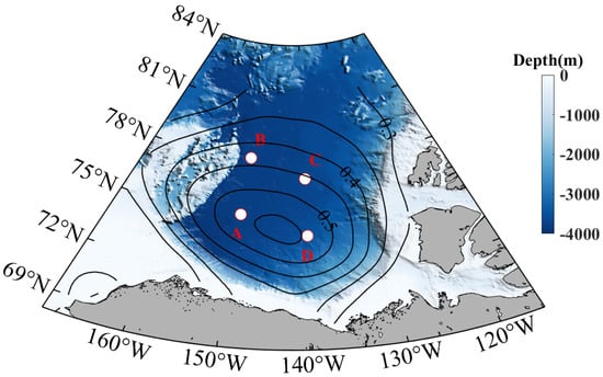 Map of the Arctic Ocean showing its major topographic features. Beaufort Gyre Freshwater experiment mooring locations are marked by white dots and labeled with A, B, C, and D, respectively. The mean surface absolute dynamic topography is shown as black contour lines reflecting the Beaufort Gyre.