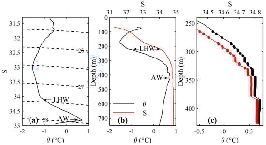A typical MMP profile recorded at station D at 6 a.m. on 19 November 2006. (a) Potential temperature and salinity (θ-S) diagram. The black dashed lines represent the potential density anomaly (kg/m3). (b) The θ and S profiles with depth. Balck and red line represent θ profile and S profile, respectively. The AW and LHW are denoted with arrows in (a,b). (c) Partial enlargement of the figure (b), the solid circle is the identified θ and S within mixed layer. Balck and red line represent θ profile and S profile, respectively.