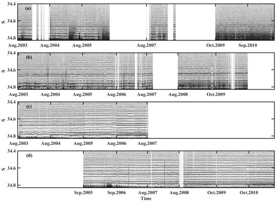The salinity–time (S-Time) at the four mooring stations during the observation period. (a), (b), (c) and (d) corresponding to station A, B, C and D, respectively. The blank parts indicate that there are no data during these periods.