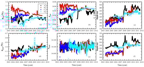 The variations in the AW core and LHW core with time at stations A–D. (a–c) The variations in the potential temperature, salinity, and depth in the AW core. (d–f) The corresponding variations in the LHW core.