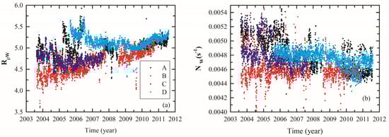 The density ratio Rρw and buoyancy frequency Nw between AW and LHW at the four stations are shown in Figure 5. From 2003 to 2011, the Rρw at the four stations ranged from 4.0 to 6.0, with a general increasing trend, except in their earlier periods (Figure 5a). These Rρw values fall within the range of 1 to 10, which meets the condition for the formation of a DC staircase based on the linear theory [38]. In Figure 5b, the change in Nw at the four stations from 2003 to 2011 was relatively weak, except for in the earlier periods, ranging from 4.4 × 10−3 to 5.4 × 10−3 1/s. At station B, Nw was stable overall but accompanied by occasional low values, which indicates that the stratification may have been weakened. Although the salinity and temperature of the AW and LHW varied significantly over time (see Figure 4), the stratification of the layer between the two water masses remained relatively stable.