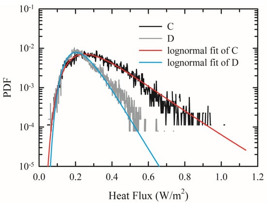 PDF of heat flux: FHc_C (black line) and FHc_D (gray line) across the DC staircases at stations C and D. The red and cyan lines represent the lognormally fits for the PDF of FHc_C and FHc_D, respectively.