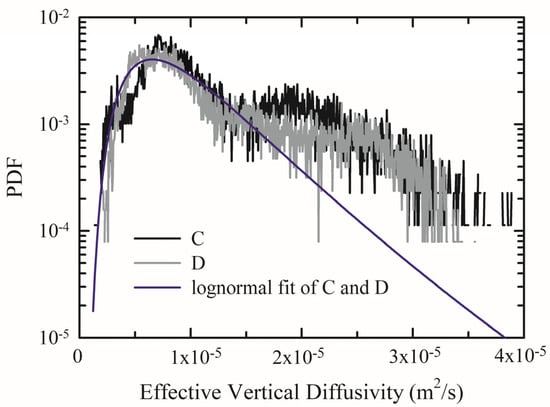 Figure 7 shows the probability density distribution of effective vertical diffusivities, KT_C and KT_D, at stations C and D. The PDF curves of both stations are roughly consistent, ranging between 2 × 10−6 and 3.3 × 10−5 m2/s with the highest probability density at approximately 6 × 10−6 m2/s.