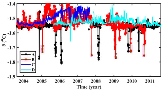Here we attempt to discuss the possible reason why the DC staircases at stations A and B were maintained for a shorter time than those at stations C and D. In the boundary regions of the Arctic Ocean, the DC staircases may frequently be absent [48] as they may experience more energetic flows [49] and interact with rough topography [50,51]. Between 2003 and 2011, some strong eddies were observed to pass by stations A and B, with depths ranging from 150 to 300 m [18]. These eddies were also found by Timmermans et al. from the ITP observation data in the upper Arctic Ocean [52]. Manley and Hunkins also observed several subsurface eddies in the region of stations A and B, with depths ranging from 50 to 300 m and diameters of 10–20 km [53]. However, Lique et al. noted the absence of any eddies at a depth of 150 m at stations C and D [18]. The water at the center of these eddies was unusually cold compared to the surrounding water, and the presence of vortices corresponded to lower buoyancy frequencies, reducing the stability of the water [44]. Figure 8 shows the time-series potential temperature of Pacific Winter Water at the four stations. The Pacific Winter Water is defined as the lowest temperature at the upper ocean due to its low temperature characteristic. At station A and station B, it was found that the potential temperature of Pacific Winter Water rapidly decreased by 0.1~0.2 °C in some short time periods. Timmermans et al. reviewed the characteristic of the eddies in Canada Basin, most of which are anticyclonic eddies with cold core [44]. Hence, we speculate the cooling of Pacific Winter Water is the signature of subsurface eddies. By further comparing Figure 8 and Figure 3a,b, we find that the time periods of the temperature cold anomaly are roughly consistent with that when the DC staircases are relatively unclear. Therefore, we speculate that the existence of eddies inhibits the occurrence of DC staircase. It should be noted that more data are needed to confirm this speculation, which is our next step.