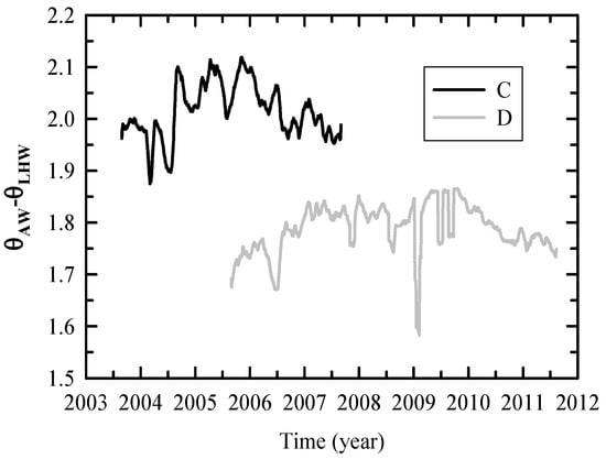 The variation in potential temperature difference between AW and LHW at the stations C (black) and D (gray).