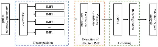 After obtaining the original vibration signal of the ocean atomic gravimeter, we propose a combined method based on improved complete ensemble empirical mode decomposition with adaptive noise and locally weighted regression filtering to process the original signal according to the idea of decomposition–extraction effective IMF-filter reconstruction; the processing flow is shown in Figure 1.