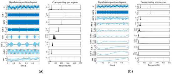 As can be seen from Figure 4, where the red solid line represents the variance contribution rate and the blue dashed line represents the correlation coefficient value. The correlation coefficients calculated by the three methods are similar to the overall distribution of the variance contribution rate. In Figure 4c, the correlation coefficients of the first-, second-, and third-order IMF components and the original signal are larger, which indicates that they carry important information about the signal, but the variance contribution rate of IMF2 is smaller, which indicates high noise content, and the correlation and variance contribution rate of the fourth, fifth, and sixth order and the original signal are poor, which indicates serious noise content. To prevent the loss of some details of the signal, we subsequently perform the noise-reduction process for the components with high noise content.