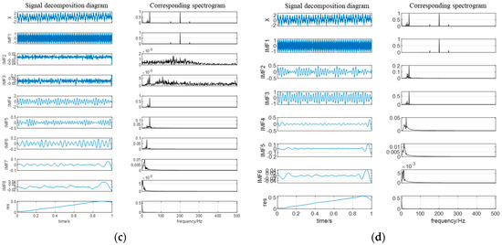Figure 3. Decomposition results and corresponding spectrograms by four methods of decomposing the simulated signal x. The left column shows the IMF of each component of the signal after decomposition for each method, and the right column shows the spectrogram corresponding to each IMF component: (a) EWT, (b) EEM, (c) CEEMDAN, and (d) ICEEMDAN.