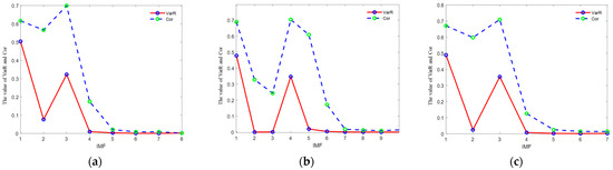 Figure 4. Correlation coefficients and variance contribution values of each IMF for different methods. (a) EEMD, (b) CEEMDAN, and (c) ICEEMDAN.