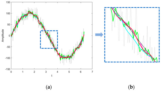 (a) Comparison of the smoothing results of several filtering methods; (b) the local enlargement. The black dotted line is the input data, the black solid line is the sine, the green line is mean filtered data, the magenta line is Savitzky–Golay filtered data, the cyan line is RLOESS filtered data, and the red line is LOESS filtered data.