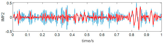 Figure 6 gives the filtering results of the LOESS method for the noise component IMF2 filtered by the ICEEMDAN decomposition. The blue line represents the IMF2 component, and the red line is the signal after noise reduction obtained by the LOESS filtering method. It can be seen that the LOESS filtering method can remove the noise interference well and retain the information in the component.