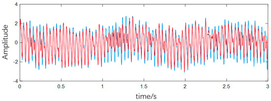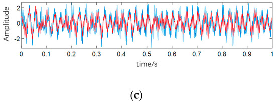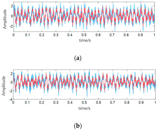 Finally, the filtered effective components and the processed noise components are reconstructed, and the results are shown in Figure 12, where the blue curve is the original vibration signal, and the red curve is the signal processed by the proposed method, which is consistent with the analysis results of the simulating signal. It shows that the method proposed in this paper can not only decompose the signal well but also reduce the noise of the signal.