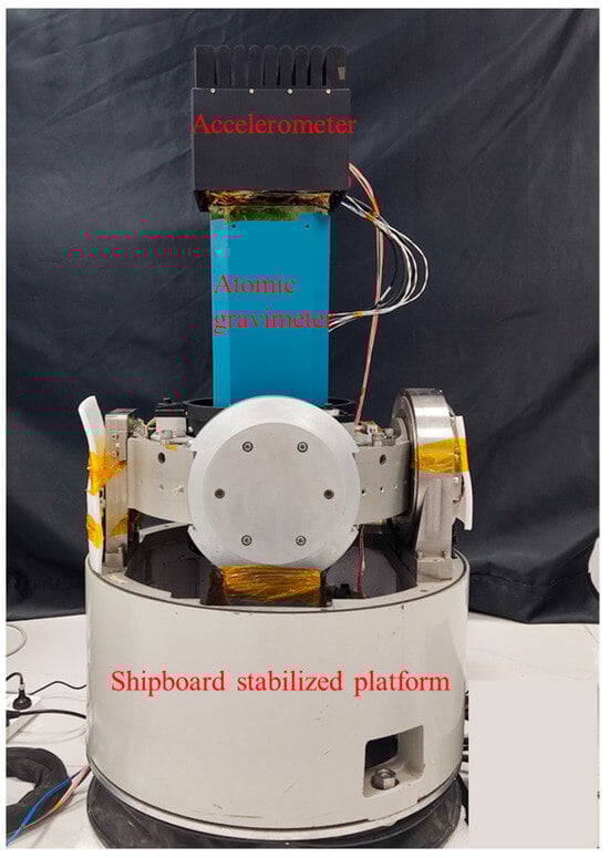 To verify the effectiveness of the algorithm in the practical application of the vibration signal of the marine atomic gravimeter, the vibration data of the atomic gravimeter were collected by navigation tests. The measurement system is shown in Figure 8, which mainly consists of an atomic gravimeter and a shipboard inertial stabilization platform accelerometer. The atomic absolute gravimeter is rigidly fixed to the upper part of the shipboard inertial stabilization platform, which is fastened to the ship deck, and the accelerometer is rigidly fixed to the atomic gravimeter to measure the vibration signal.