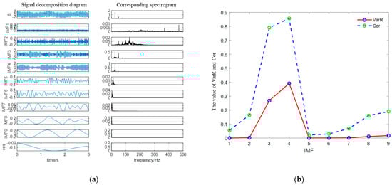 We determine the number of IMF components using the correlation coefficient Cor and variance contribution rate [19,20,21] VarR in this paper, which are calculated as shown in Equations (1) and (2). The larger the Cor, the better the correlation between the IMF component and the original signal, which better reflects the physical information of the original signal. On the contrary, a smaller Cor indicates that the correlation between the IMF component and the original signal is poor, which is not conducive to the analysis of the original signal and can be regarded as redundant information. The same is true for the variance contribution rate.