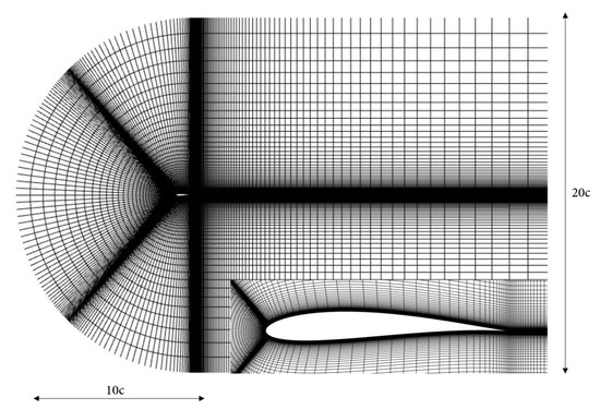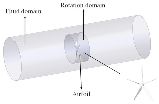 In this paper, ANSYS 21R2 is used for numerical simulation, and the flow field is set as a three-dimensional incompressible steady-state viscous turbulent field; the medium is water, the flow velocity is 0.5–0.8 m/s, the turbulence level is 5%, and the turbulent viscosity ratio is 10. 2D mesh division, as shown in Figure 4. Figure 5 shows the computational model of this paper with the blade placed in the rotation domain. The grid generation software for the two-dimensional grid is Pointwise, the field is 1m, and the grid structure is C-grid, C-grid. The grid can better fit the leading edge curvature of the airfoil without generating singular points. In addition, the C-grid is natural, and the encrypted trailing edge grid is beneficial to capture the wake shape. The far field behind the calculation domain is 20 times the chord length, and the far fields above, below, and in front are all 10 times the chord length, y += 1, and the grid growth rate of the boundary layer is 1.1.