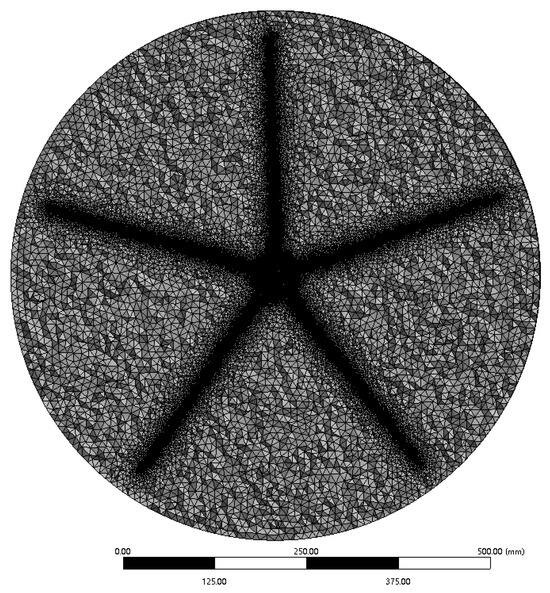 The physical model of the blade is formed by the counterclockwise rotation of an asymmetric airfoil, with the airfoil thickness varying in the range t/c = 0–2.5%, the airfoil curvature varying in the range f/c = 10–15%, and the chord length is c. Thickness is the ratio of the maximum vertical diameter of the airfoil to the chord length c. Curvature is the ratio of the maximum tangent arc top height of the airfoil to the chord length c. The position of the blades in the turbine is shown in Figure 1. Figure 2 represents the geometry of the airfoil cross section as the thickness and curvature change.The length of rotation domain is r, and the length of the drainage basin is 15R. The grid generation adopts ICEM 2022R2. The grid type is a static domain structured grid, and the rotation domain is an unstructured grid. In the drawing, the outermost cylindrical surface and the upper and lower circular bottom surfaces are the interface where the rotation domain intersects with the static domain and where the hydraulic turbine is located. In order to help explain the grid diagram of the rotation domain, as shown in Figure 3, the number of grid units is 2,238,392, and the number of nodes is 407,312. The expansion option is smooth transition, and the transition ratio is 0.272.