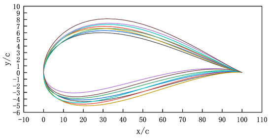A suitable mathematical model is used to optimize the airfoil instead of the real objective function, which is called the surrogate model method. The Kriging model adopted in this paper often deals with nonlinear problems in engineering [18]. To construct the surrogate model, the sample space is sampled, and, in this paper, Latin hypercube sampling [19] is chosen, which can obtain more comprehensive spatial information with fewer points. The addition is performed according to the LCB addition criterion, using a 4th CST parameterization [20] to optimize 10 design variables, a maximum number of iterations of 100, and a maximum number of sub-optimization iterations of 200. The CST method is used to represent the geometric coordinates of the airfoil, and the upper surface equations are:
