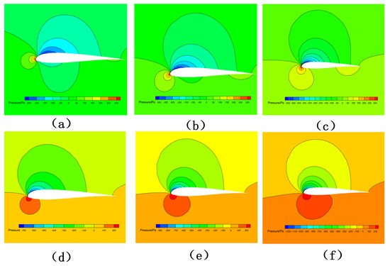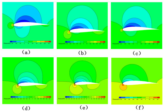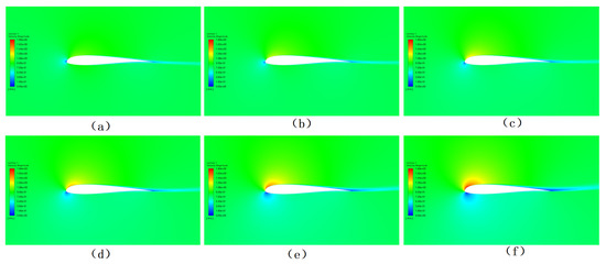 Pressure field of the airfoil at 0° (a), 2° (b), 4° (c), 6° (d), 8° (e), and 10° (f) before optimization.