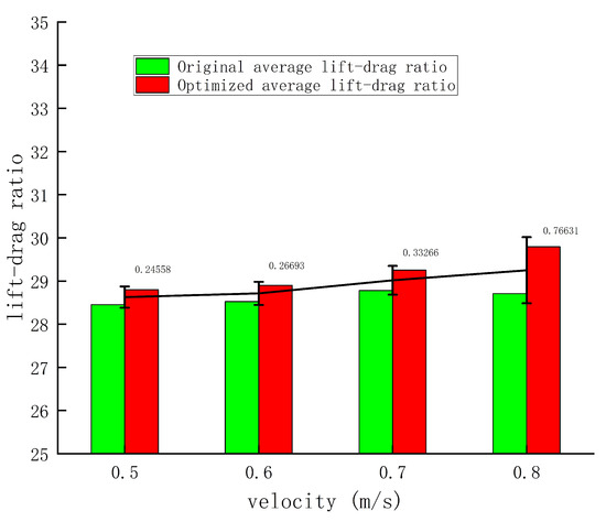 Figure 13 shows the comparison of lift–drag ratio between the original airfoil and optimized airfoil in the low-flow range, which shows that the best lift–drag ratio of the original airfoil is 109.39. The best lift–drag ratio of the optimized airfoil is 113.80, which is an improvement of 4.03%, and the optimized airfoil has a significantly better lift–drag ratio than that of the original airfoil.