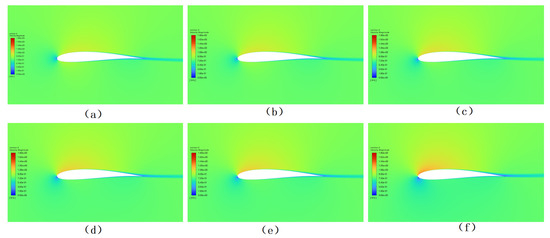 Pressure field of the airfoil at 0° (a), 2° (b), 4° (c), 6° (d), 8° (e), and 10° (f) after optimization.