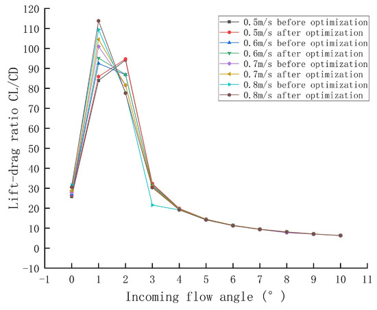 Lift-to-drag ratio before and after airfoil optimization in low flow range.