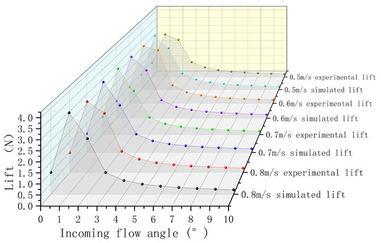 In addition, this paper carries out the experimental verification of the lift force. An experimental platform was built, as shown in Figure 15a, using a 60CST-M00630 asynchronous motor (Okoda, Changzhou, China) and a XDS100v2 simulator (Ickey, Shanghai, China), controlling the flow rate of the water tank at 0.5–0.8 m/s, printing the 0.1 m airfoils, fixtures, and part of the structural parts with an ANYCUBIC PHOTON MONO X 3D printer (ANYCUBIC, Shenzhen, China), and curing them with a light curing machine. The lift force was measured by a tensiometer, the flow rate was measured by an LS300A flow meter (JINSHUI HUAYU, Weifang, China), the printing material was transparent resin, and the experimental process is shown in Figure 15b. Compared with the simulation results, the average error is 4.076%, and the data comparison is shown in Figure 16, which illustrates the reliability of the simulation results. The average error observed in the experimental verification may be related to the experimental conditions, the limitation of the number of samples, and other reasons. Optimization of the experimental equipment, an increase in the number of samples, and comparative analysis and other methods can help us evaluate the performance of turbine airfoil design more accurately.