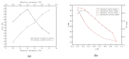 The airfoil lift with bending and thickness is shown in Figure 17a; a numerical simulation of the optimized blade after twisting by the Wilson method shows that the blade varies with the wingspan chord length and twist angle, as shown in Figure 17b. Lift shows a tendency to increase and then decrease with increasing thickness; the maximum lift is 30.259% higher than the average lift, lift increases with increasing curvature, and the maximum lift is 21.491% higher than the average lift. When the thickness is more than t/c = 12%, lift begins to decrease, mainly due to the trailing edge separation effect of the airfoil. The overall hydrodynamic performance of the turbine is improved by optimizing the lift–drag ratio and lift of the airfoil.