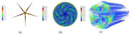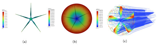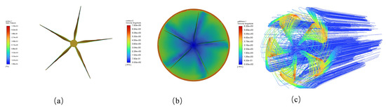 Blade pressure cloud at 0.5 m/s (a); velocity cloud (b); streamline diagram (c).