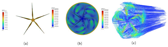 Blade pressure cloud at 0.8 m/s (a); velocity cloud (b); streamline diagram (c).