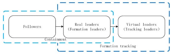 The system composed by USVs is considered. The USVs in the system can be divided into three categories, namely, the virtual leader or tracking leader, the real leaders or formation leaders, and the USV followers, as shown in Figure 2. The reference trajectory for the macroscopic motion of the entire multi-USV system is generated through the virtual leader, which is numbered 0. And the real leaders, which are numbered , are required to track the trajectory while completing the specified formation shape. Note that the formation shape in this paper is not time-varying. The followers need to converge to the convex hull formed by the real leaders, which are numbered . The information exchange among USVs is described by digraph G. The virtual leader has no neighbors, while a real leader can receive information from the virtual leader or the other real leaders, and a follower can receive information from the real leaders or the other followers.